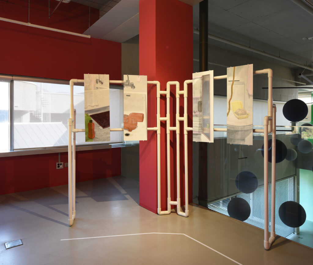 이예주는 디지털 시대의 잔상과 무의식의 형상을 아이소핑크와 석고로 현실화한다. 재료의 저항과 신체 감각이 맞닿는 지점에서 비물질이 몸을 얻는다. 정수현은 투석기의 운동 원리와 물리적 구조를 기하학적 회화로 전환해, 보이지 않는 힘과 균형의 질서를 시각화한다. 홍세진은 카메라와 화면, 인공 조명 같은 기술적 환경 속에서 감각이 분절되고 재구성되는 과정을 평면 위에 남긴다.