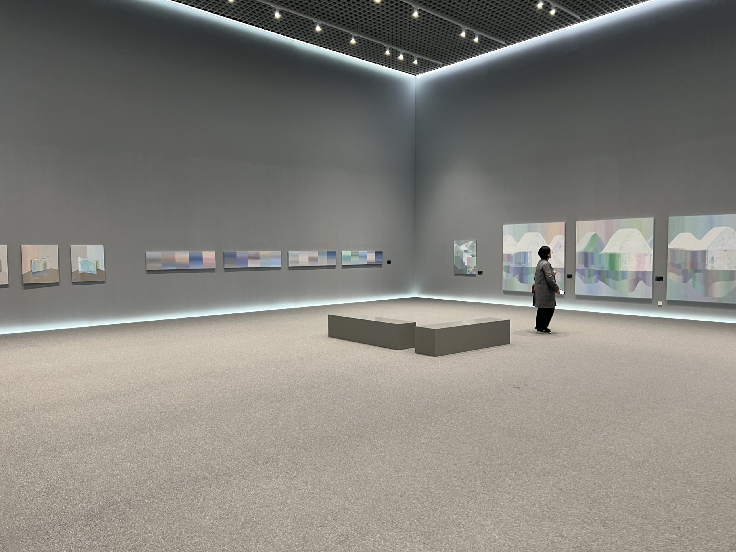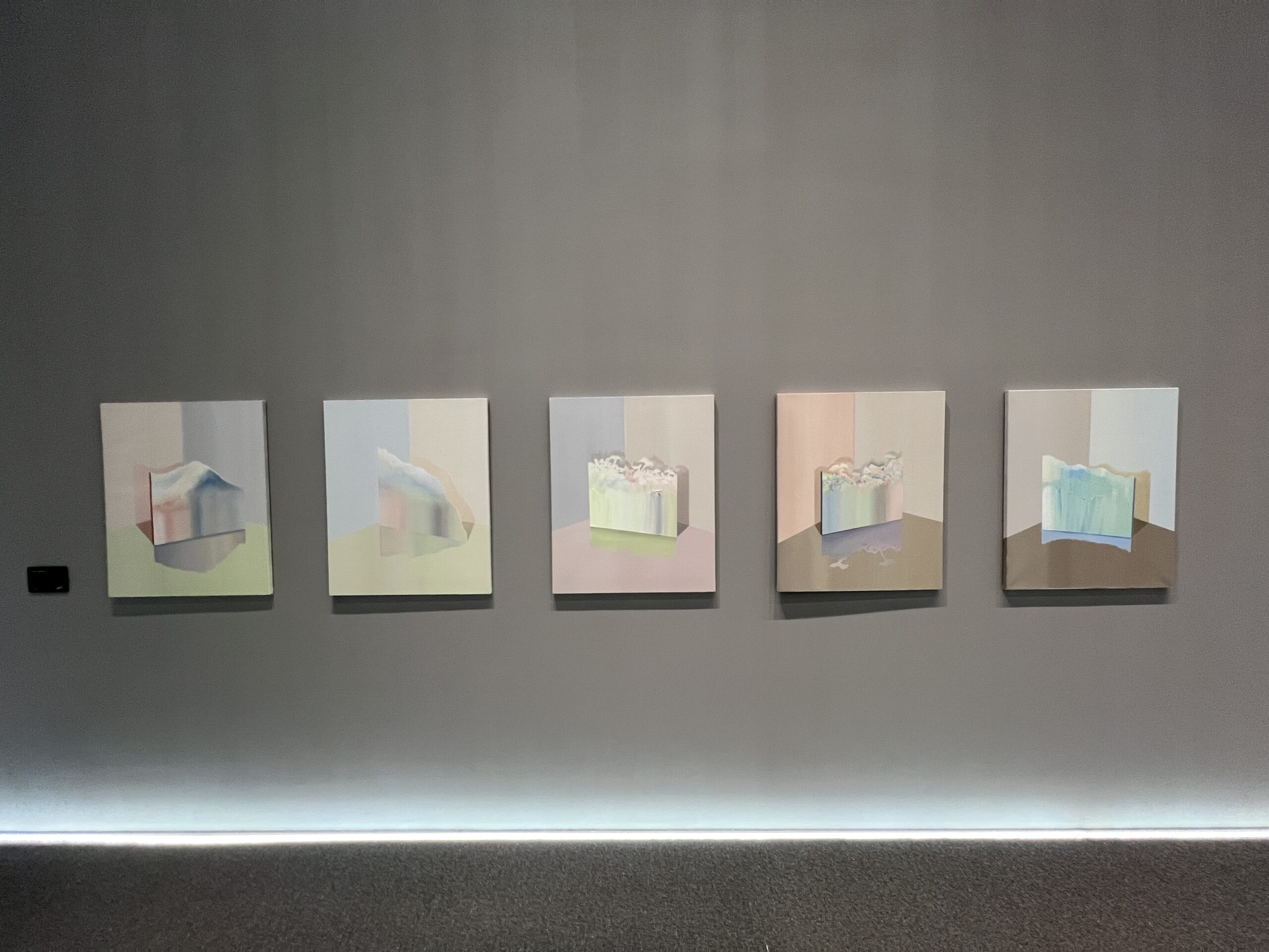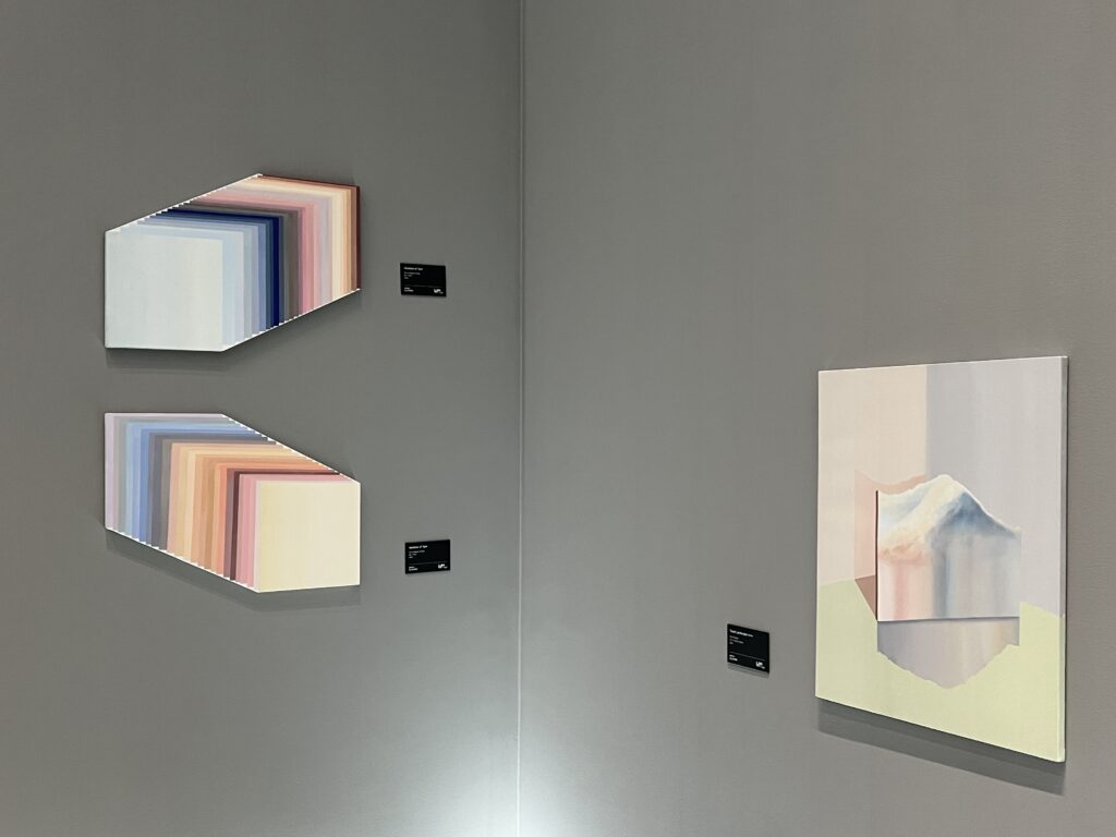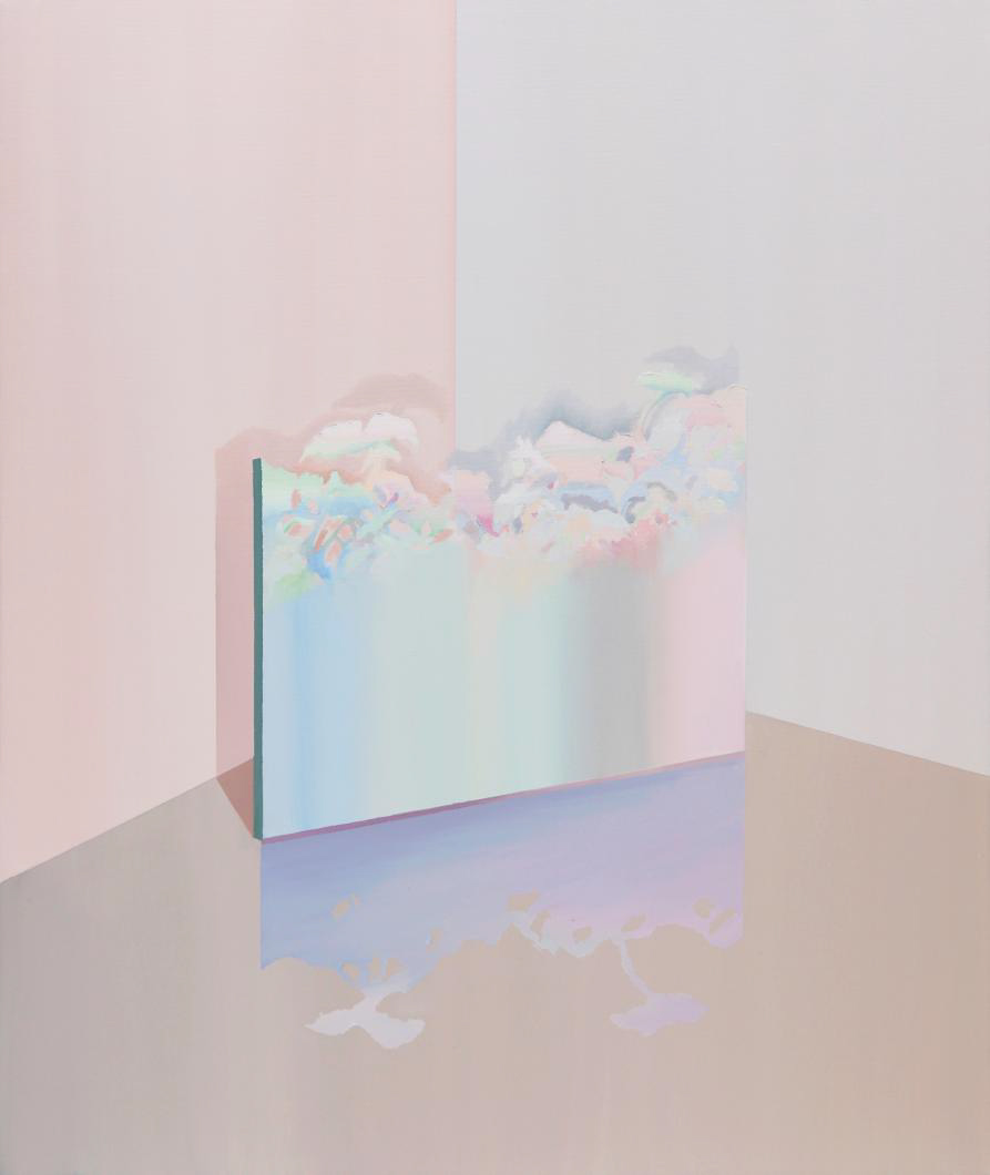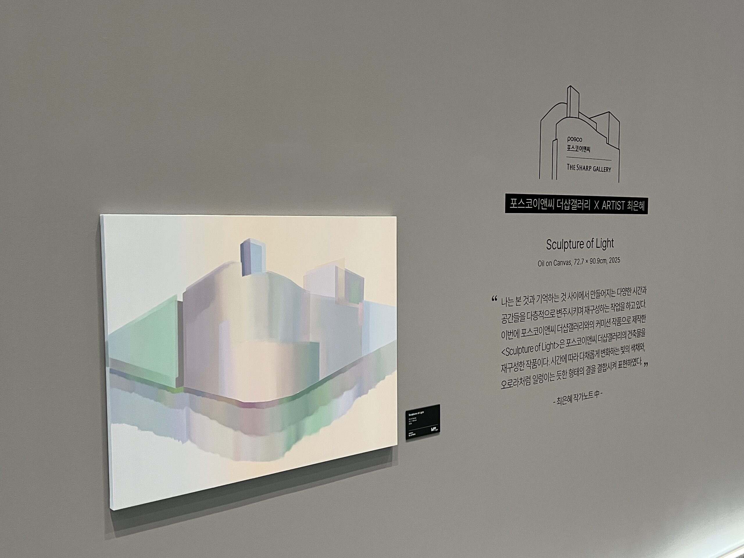 작가는 삶의 단면에서 마주친 빛의 형상과 기억의 조각들을 시간의 결로 엮는다. 아이슬란드와 노르웨이의 설산에서부터 비행기 창 너머 스친 하늘빛, 바람에 일렁이던 오로라의 형상까지—모든 풍경은 작가의 기억 속에서 응집된 감각으로 재구성된다. 파스텔톤의 미묘한 그라데이션과 기하학적 구성은 구상과 추상의 경계를 유연하게 넘나들며, 보는 이로 하여금 내면 깊은 곳의 기억을 불러일으킨다.