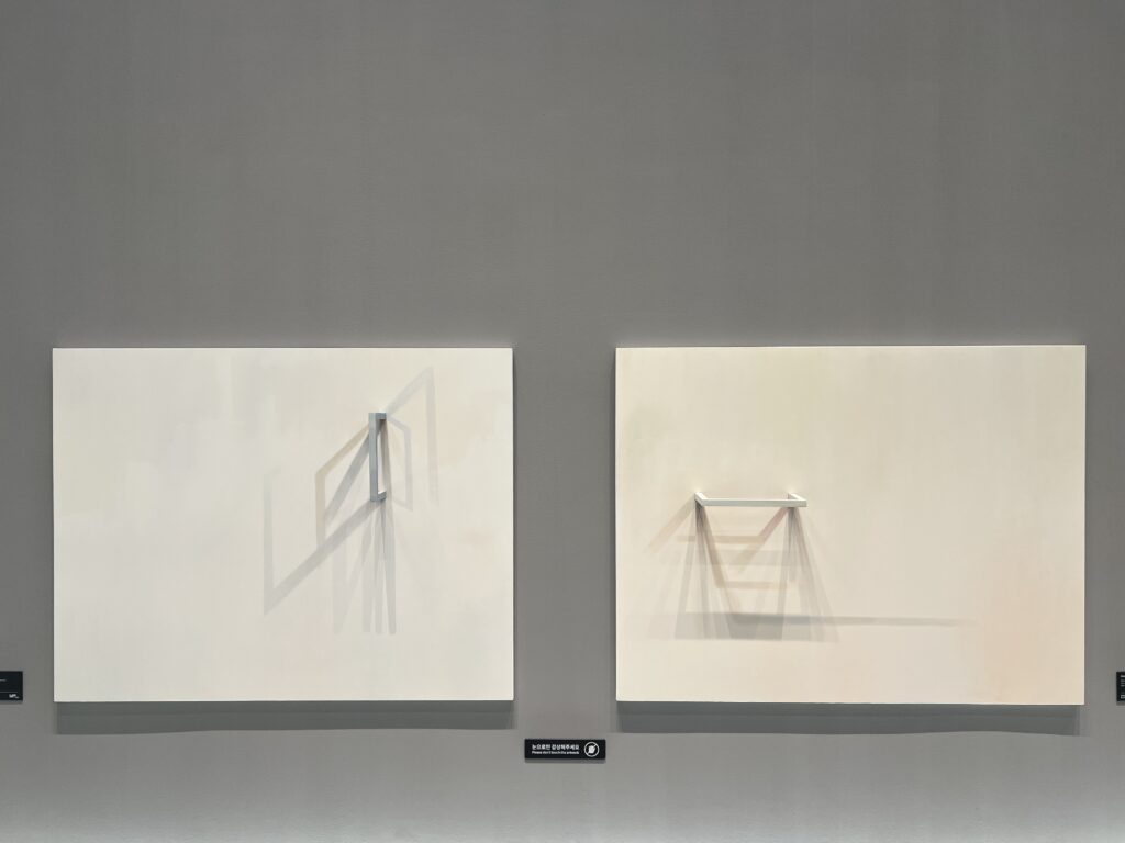 〈Dialogue〉 연작은 그림자와 실재 사이의 ‘대화’를 다룬다. 작가가 직접 그려 넣은 그림자와 실제 공간의 빛이 만들어내는 그림자가 교차하며, 환영과 실재의 경계에서 생기는 서사를 펼쳐낸다. 이 확장된 평면 위에서 관람자는 시각적 감상에 머무르지 않고 사유의 깊은 지층으로 초대된다. 전시 말미에 선보이는 커미션 작품 〈Sculpture of Light〉는 포스코이앤씨 더샵갤러리의 건축 구조를 모티프로 재구성해, 장소성과 기억이 뒤섞인 환상적 풍경을 구현한다.
