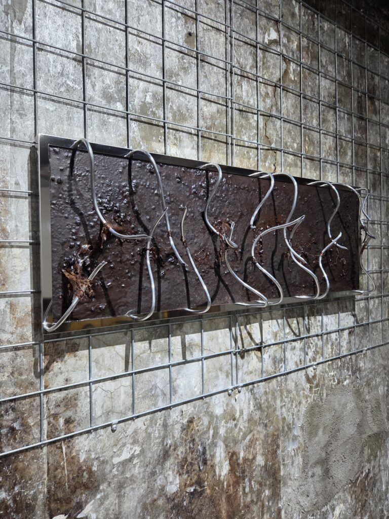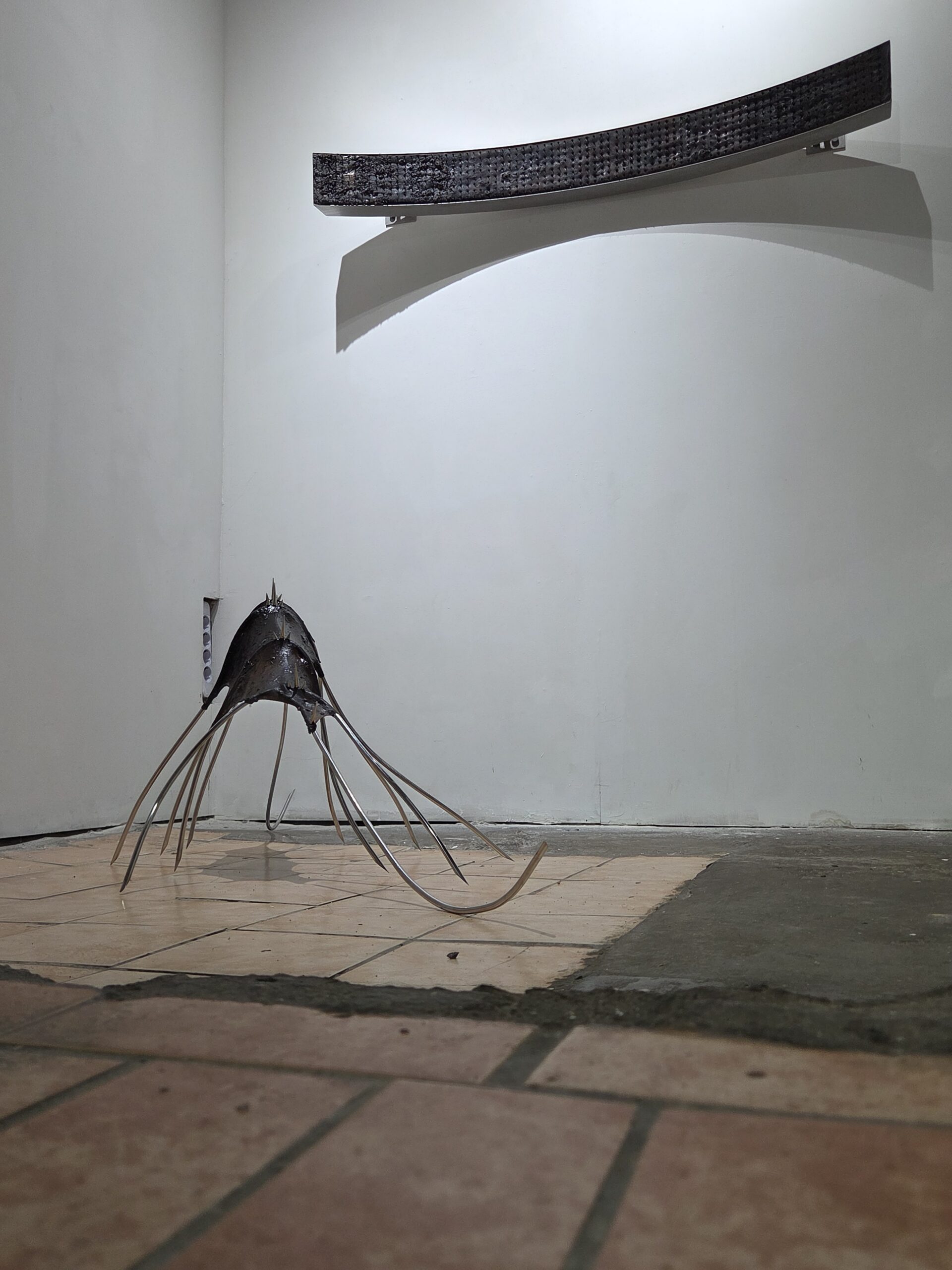 김영재, 지면종(地面種), 2025, 스테인리스, 라텍스, 49 x 65 x 155cm / 포획, 2025, 스테인리스, 라텍스, 볼트와 너트, 12 x 125.5 x 21cm 이미지_양승규